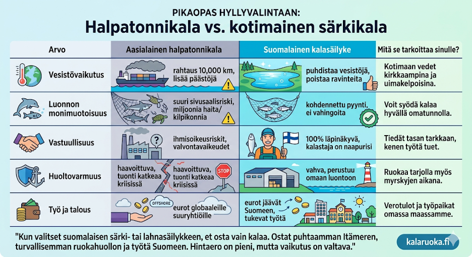 | Vastuullisuus | Ihmisoikeusriskit ja valvontavaikeudet kaukaisilla merillä. | 100 % läpinäkyvä. Kalastaja on naapurisi ja noudattaa Suomen lakia. | Tiedät tasan tarkkaan, kenen työtä tuet. |